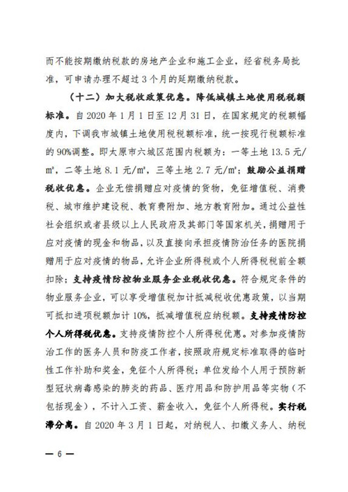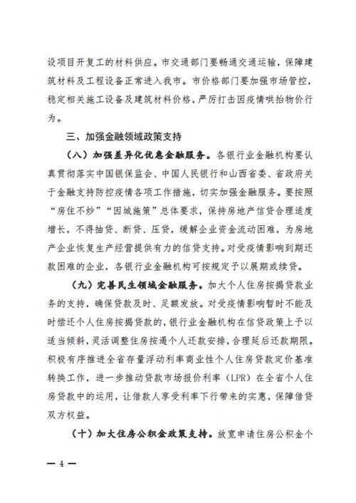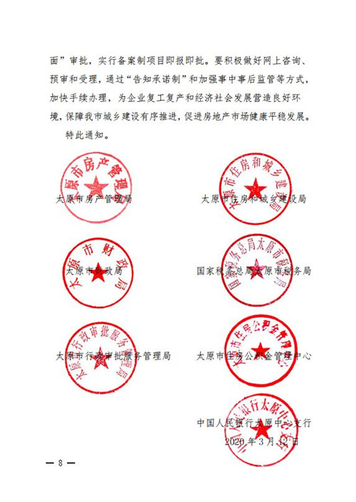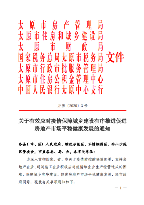 3月12日,山西省太原市房產(chǎn)管理局、太原市住房和城鄉(xiāng)建設(shè)局、太原市財(cái)政局、國(guó)家稅務(wù)總局太原市稅務(wù)局等七個(gè)部門聯(lián)合發(fā)布《關(guān)于有效應(yīng)對(duì)疫情保障城鄉(xiāng)建設(shè)有序推進(jìn)促進(jìn)房地產(chǎn)市場(chǎng)平穩(wěn)健康發(fā)展的通知》(簡(jiǎn)稱《通知》),《通知》顯示,為支持房地產(chǎn)企業(yè)、建筑施工企業(yè)積極應(yīng)對(duì)疫情給企業(yè)生存經(jīng)營(yíng)造成的困難,促進(jìn)房地產(chǎn)市場(chǎng)平穩(wěn)健康發(fā)展,共出臺(tái)了15項(xiàng)措施。
