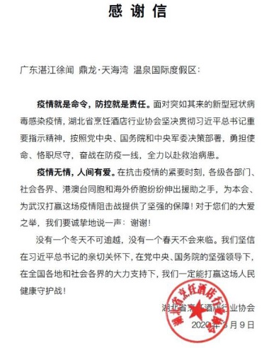 這是一封湖北給鼎龍·天海灣的信,為表示對(duì)鼎龍·天海灣千里馳援湖北同胞而寄出的感謝信。