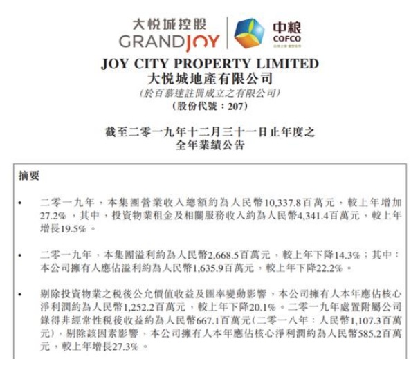 大悅城地產(chǎn)2019年溢利約為26.69億元,同比下降14.3%;其中股東應(yīng)占溢利為16.26億元,同比下降22.2%;剔除投資物業(yè)之后公允價(jià)值收益及匯率變動(dòng)影響,大悅城地產(chǎn)股東應(yīng)占核心凈利潤(rùn)約為12.52億元,同比下降20.1%。