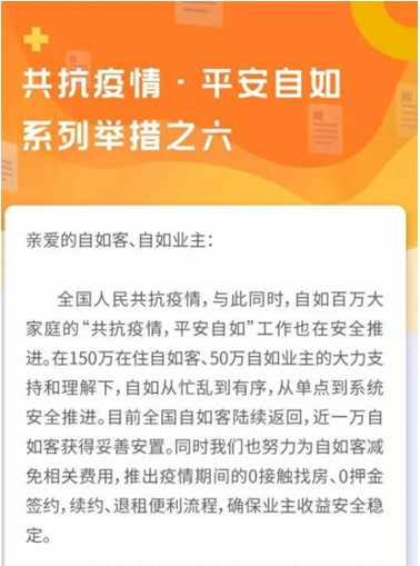 這是疫情以來自如發(fā)布的第六次抗疫舉措。此前其推出的多項(xiàng)舉錯中包括:協(xié)助社區(qū)和相關(guān)政府部門收集租客返程信息;按時為業(yè)主支付租金;為全國150萬在住租客減免2月50%服務(wù)費(fèi);為近5萬武漢租客減免2月一半租金及全月服務(wù)費(fèi)約3000萬元;為符合相應(yīng)條件的返程租客提供安置房源;上線短續(xù)優(yōu)惠、0押金簽約等。