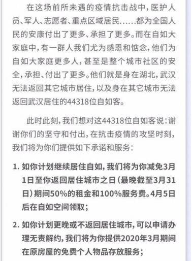 為身在湖北仍無法返回其它城市以及身在其它城市仍無法返回武漢,且計劃返程后繼續(xù)租住自如的租客減免部分租金服務(wù)費(fèi);為計劃3月31日后返回或不返回的,提供無責(zé)解約服務(wù),同時提供3月期間原房屋的免費(fèi)個人物品存放服務(wù);自如管理層自愿進(jìn)行一季度降薪20%-50%,合并用于補(bǔ)貼上述費(fèi)用減免舉措。