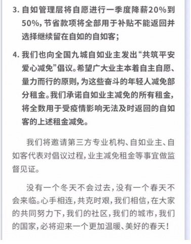 三、自如管理層自愿進(jìn)行一季度降薪20%-50%,節(jié)省款項(xiàng)全部用于補(bǔ)貼不能返回并選擇繼續(xù)留在自如的租客。