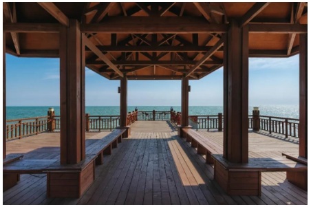 延伸入海的木棧橋,一面連著白色沙灘,一面延伸入蔚藍(lán)海水。漫步其上,置身在大海心里,感受綠意在大海的深藍(lán)中氤氳的盎然生機(jī)。在這里,你才知道自己也可以將一件既沒有目的也無所謂結(jié)果的事——散步,當(dāng)成一件正經(jīng)事,而且做得津津有味、氣定神閑。而此時陪在你身邊的是:棧橋上寫滿幸福時光的木板路……