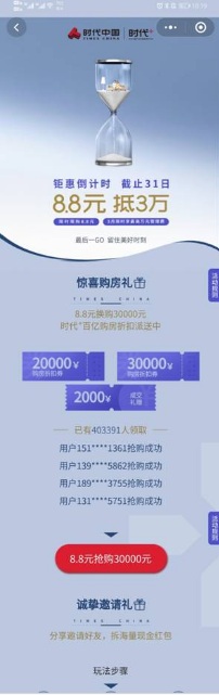 來看一個(gè)實(shí)例,由思為幫助時(shí)代中國打造的時(shí)代+數(shù)字營銷平臺,在線上發(fā)起了8.8元抵3萬元的活動,目前數(shù)據(jù)是403391。在線上,開發(fā)商并沒有花費(fèi)太多的時(shí)間成本,沒有花費(fèi)太多的營銷費(fèi)用成本,就吸引了40萬的精準(zhǔn)客戶。