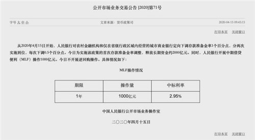 4月15日,央行按慣例開展每月新作中期借貸便利(MLF),本次1年期MLF新作規(guī)模1000億元,中標(biāo)利率2.95%,較此前下調(diào)20個基點(BP)。這是繼3月30日逆回購利率“降息”20個基點后,時隔僅半個月,又一政策利率“降息”。