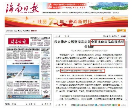 3月7日晚,海南省委辦公廳、省政府辦公廳印發(fā)了《關(guān)于建立房地產(chǎn)市場(chǎng)平穩(wěn)健康發(fā)展城市主體責(zé)任制的通知》(以下簡(jiǎn)稱《通知》),提出發(fā)展安居型商品住房,以及實(shí)行本地居民多套住房限購政策和商品住房現(xiàn)房銷售制度等。