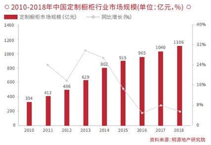 ⾏業(yè)內定制化櫥柜越來越受歡迎。近⼏年消費者個性化定制的需求催⽣了定制櫥柜的產⽣,定制櫥柜⾏業(yè)也保持持續(xù)穩(wěn)定增⻓的態(tài)勢,由2010年的334.1億元增⾄2018年的1106.11億元,年均復合增⻓率超過18%。與之相關的,此外,全屋定制成為主流趨勢,櫥柜企業(yè)拓展品類成為發(fā)展⽅向。近⼏年來,⼤數(shù)據、云計算不斷助⼒產業(yè)創(chuàng)新升級,全屋定制異軍突起,以櫥柜為主營業(yè)務的企業(yè)慢慢向其他品類拓展,增強⾃⾝競爭能⼒。