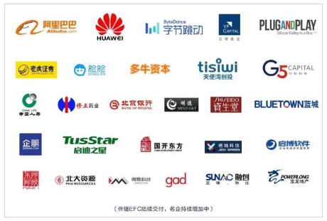 除了阿里巴巴外,眾多名企如字節(jié)跳動(dòng)、老虎證券、臉臉科技、云鋒基金、G5 Capital、Plug&Play、多牛資本、天使灣創(chuàng)投、初橙、明德自動(dòng)化、修正藥業(yè)、華為、北京銀行等,也均已進(jìn)駐EFC。