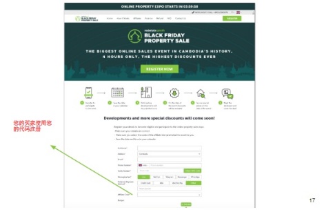 本場活動中,投資者全程無須出門,只需要提前通過代碼注冊,輸入代碼:REAKH在線上一鍵預(yù)先注冊會員,便可在活動當(dāng)日上線進(jìn)入展區(qū)參展。預(yù)先使用聯(lián)盟推薦代碼注冊會員,是為了保證參展購房投資者的資金安全及售后保障。