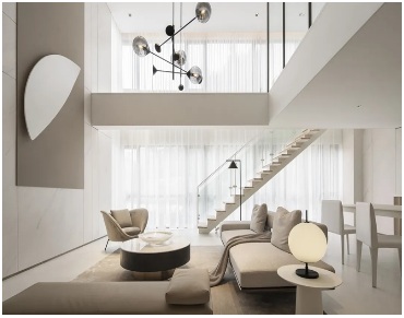 甲方當時的需求其實是想改個色調(diào),我說你們銷售不太好并不是因為色調(diào),最重要的是策略有問題。所以我們在整個設計上做的比較概念,用設計引導客戶,從營銷角度的策略思維去引導——把樓梯放在明顯的位置,因為它不只是空間中的一個造型,它會成為空間流動的引導,它的存在讓客戶直觀地了解這個房子的優(yōu)勢,相當于用平層的價格買了一個復式的房子,最終實現(xiàn)出來的效果非常好,客戶也很喜歡。