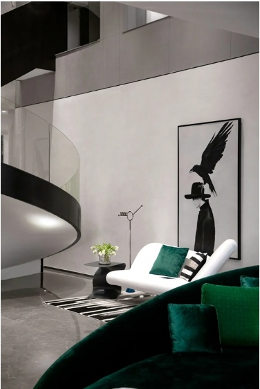 因為重慶中海天鉆層高達5.1米,實際上是現(xiàn)在市面上已經(jīng)非常難得的獨特的產(chǎn)品。那么獨特的產(chǎn)品一定有獨特的設計,否則它的這種價值感就出不來,所以我們設定它是“自由的藝術(shù)家”來居住的空間,針對它未來可能的客群而設計——他們追求獨特,已經(jīng)實現(xiàn)了財富自由,精神上也是自由的。