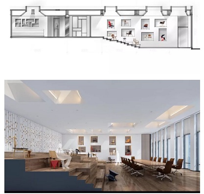 我們最終把這里設(shè)計(jì)成了一個(gè)多功能廳,具有展廳的功能。放置了很多100年以來經(jīng)典款的椅子,它們有些是展品,只可遠(yuǎn)觀;有些放在階梯上,客人可以坐下親身體驗(yàn),體驗(yàn)好的設(shè)計(jì)對(duì)感官、對(duì)觸覺的影響。