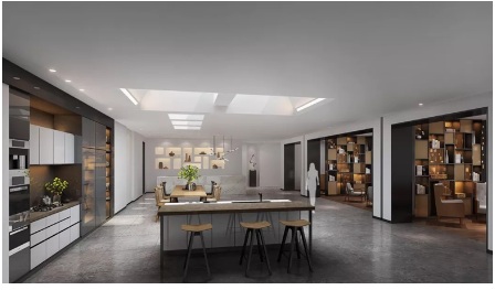 多功能區(qū)右邊有整塊玻璃,客人也可以看到外面的景觀,視野豁然開朗。1.5米的平臺(tái)上設(shè)計(jì)了烹飪體驗(yàn)區(qū),并且通過可開合的門與多功能區(qū)連通。這里不定期會(huì)舉行不同的聚會(huì)活動(dòng),成為感受建筑功能和氣氛的空間。