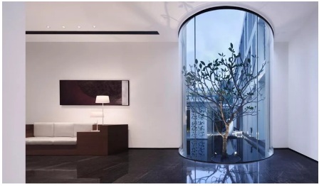 透過電梯廳的弧形玻璃,可看到戶外景觀樹。另外建筑頂部還開了一些采光天井,使空間更有趣味,同時(shí)白天不再需要開燈,節(jié)能環(huán)保。下午三點(diǎn)左右是天井下光影效果最豐富的時(shí)候,也正是客人到達(dá)的合適時(shí)間。