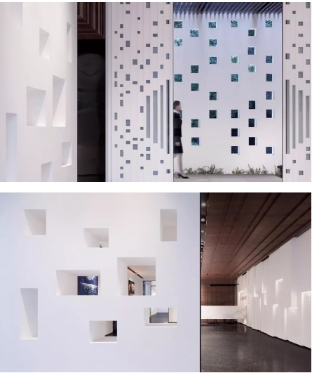 接待廳右邊是灰空間長(zhǎng)廊,回頭通過一些洞口看到外面的景色。外面從洞口可以看到里面的藝術(shù)品局部,引起人的參觀欲望。藝術(shù)品定期更換,變化豐富。