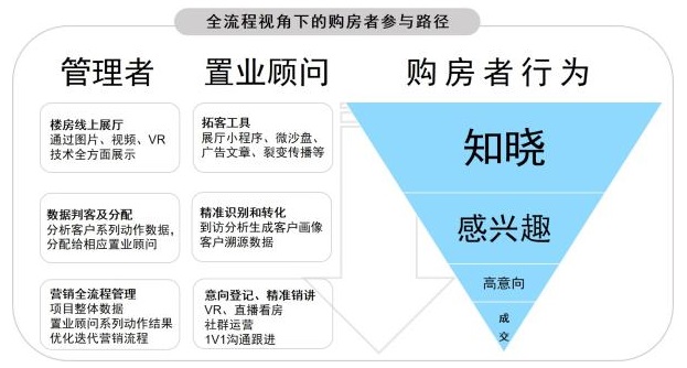 在新的競爭形式下,房地產(chǎn)客戶的全生命周期發(fā)生了變化。不管地產(chǎn)人是否樂意,整個營銷拓客行為已經(jīng)被前置,客戶對一個項(xiàng)目的初次印象產(chǎn)生在線上。也就是說,戰(zhàn)爭提前拉響,主戰(zhàn)場在線上,這是我們的第一個結(jié)論。再從全流程視角觀察營銷過程中購房者的參與路徑。從知曉-感興趣-高意向到成交,如果通過一套系統(tǒng)把每個環(huán)節(jié)都做數(shù)字化的沉淀和應(yīng)用,讓置業(yè)顧問更便捷地拓展更多客戶、更智能地管理高意向客戶,并打通線上咨詢和線下看房流程,我們就相當(dāng)于在整個戰(zhàn)線建造了一調(diào)隨取隨用源源不斷的彈藥供應(yīng)鏈。