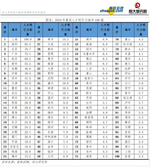 恒大研究院、智聯(lián)招聘發(fā)布的《2019年最具人才吸引力城市100強(qiáng)》。