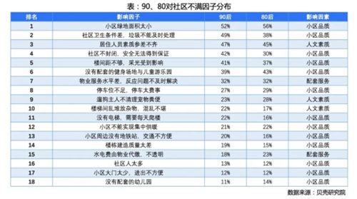 在調(diào)查中發(fā)現(xiàn),小區(qū)品質(zhì)是影響90后購房的最重要因素,包括社區(qū)是否有良好的生活環(huán)境、完善的配套設施等。調(diào)研中發(fā)現(xiàn)小區(qū)的綠化面積不足和衛(wèi)生環(huán)境差是90后群體對當前社區(qū)最為不滿的因子。