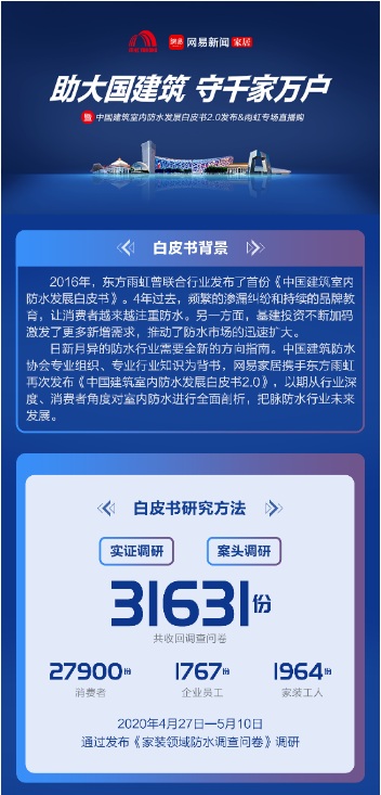 此次白皮書的發(fā)布基于最新的行業(yè)數(shù)據(jù),以及今年?yáng)|方雨虹聯(lián)合網(wǎng)易家居在線上開展的“家裝領(lǐng)域防水調(diào)查”。千呼萬(wàn)喚始出來,白皮書2.0不再半遮面,而是以最開放的態(tài)度呼吁全行業(yè)對(duì)于防水的關(guān)注。