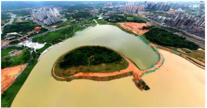 暴雨襲擊下,知識城鳳凰湖湖水渾濁不堪。而在建中的九龍湖,經(jīng)一夜暴雨后水位大漲,現(xiàn)已蓄滿,連觀光連廊也已淹沒。九龍湖湖中小島及過島通道,將湖水隔成了兩個世界,涇渭分明:南側(cè)較清,北側(cè)渾濁,儼然一副太極圖。