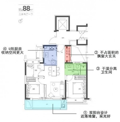 建面約88㎡:三開間朝南+超大雙陽臺!
