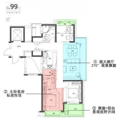 建面約99㎡戶型,是更符合年輕人的審美,面寬巨幅橫廳連接轉角大飄窗,約270°超廣角采光,景觀視野不輸120㎡左右的三房!雙臥朝南+主臥套房+雙衛(wèi)設計,實用性和舒適度兼具!