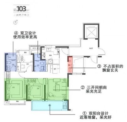建面約103㎡戶型,和前期的“高層爆款”格局基本一致,經典的三開間朝南+南北通透+主臥套房+雙衛(wèi)設計,不一樣的是陽臺更大,餐廳也帶有飄窗,采光和通風更佳!