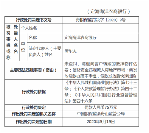 處罰公開信息披露稱,定海海洋農(nóng)商銀行未查糾、清退向客戶轉(zhuǎn)嫁的抵押物評估費(fèi);信貸資金違規(guī)流入房地產(chǎn)市場;新發(fā)放貸款辦理不審慎,貸款發(fā)放后快速出險(xiǎn)。