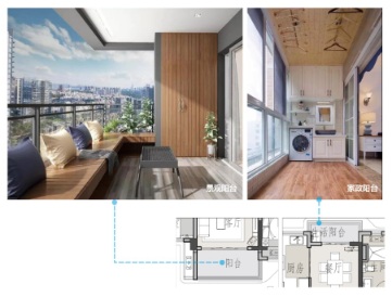全戶型南北雙陽(yáng)臺(tái)設(shè)計(jì)——景觀陽(yáng)臺(tái)放松身心,家政陽(yáng)臺(tái)收納生活。家政陽(yáng)臺(tái)設(shè)置次凈衣模塊與消毒模塊。舉個(gè)例子,下班買(mǎi)菜回家直接放回冰箱,需要換掉的外套也可以放去家政陽(yáng)臺(tái),讓“次凈”的衣服不進(jìn)入客廳,當(dāng)需要清洗時(shí)只需一步就能將臟衣服拿去洗衣機(jī)。