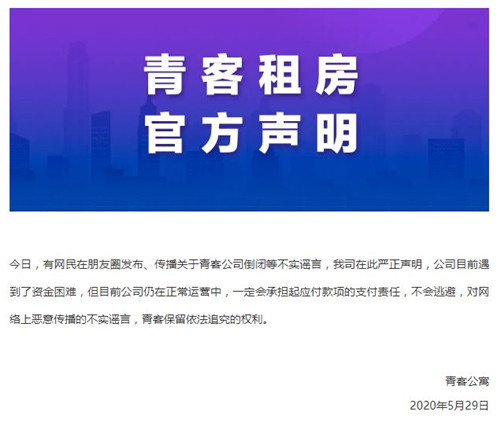 房訊網(wǎng)訊 5月29日晚間,青客公寓官方微信發(fā)布聲明,辟謠近日朋友圈傳播的“青客公司倒閉”等不實(shí)言論。