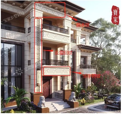 象征高升與如意,寓意富貴綿延,健康順意。彰顯貴族之風(fēng),傳遞深厚福澤。用于屋檐檐口、門廳構(gòu)飾、窗間墻等區(qū)域。作為這套房子反復(fù)奏響的御派大調(diào)