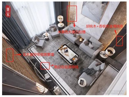 客廳地磚由拋光磚升級為大理石通體磚,主色調(diào)優(yōu)雅爵士白+意大利灰,黑白雙層波導(dǎo)線。沙發(fā)背景墻兩側(cè)米黃大理石拉槽;胡桃木飾面+香檳色金屬線條,營造一種優(yōu)雅略帶傲慢的氛圍,主人生活品味與審美的無聲表達