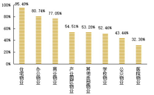 2020中國(guó)物業(yè)服務(wù)百強(qiáng)企業(yè)數(shù)據(jù)顯示,有95.49%的企業(yè)布局住宅業(yè)態(tài),而涉足學(xué)校物業(yè)、公眾物業(yè)和醫(yī)院物業(yè)的企業(yè)最少,數(shù)量占比分別為52.46%、43.44%和32.38%,非住宅物業(yè)市場(chǎng)還有待于企業(yè)進(jìn)一步開發(fā)。