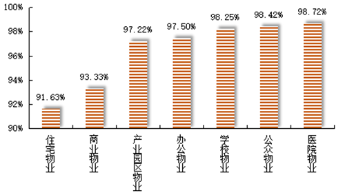 從繳費(fèi)率來看,非住宅業(yè)態(tài)物業(yè)費(fèi)收繳率高于住宅物業(yè)。資料顯示,百強(qiáng)房企非住宅各業(yè)態(tài)收繳率普遍高于住宅業(yè)態(tài)。面向單一業(yè)主的醫(yī)院物業(yè)收繳率最高,達(dá)98.72%;公眾物業(yè)、學(xué)校物業(yè)的收繳率分別為98.42%、98.25%;面向企業(yè)收費(fèi)的辦公物業(yè)、產(chǎn)業(yè)園區(qū)物業(yè),因企業(yè)支付能力較強(qiáng),收繳率較高,分別為97.50%、97.22%;商業(yè)物業(yè)由于以中小商戶為主且商鋪眾多,收繳率相對(duì)偏低,為93.33%,但也高于住宅物業(yè)收繳率;由于住宅物業(yè)面向支付能力和意愿最低的自然人,收繳率最低,為91.63%。