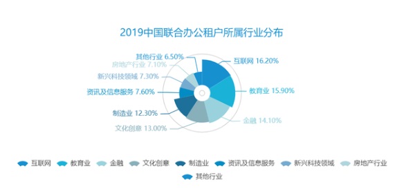 從入駐租戶的行業(yè)分布來看,2019年租戶集中較多的前三個行業(yè)分別為互聯(lián)網(wǎng)行業(yè)、教育行業(yè)、金融行業(yè),占比分別為16.2%、15.9%、14.1%。