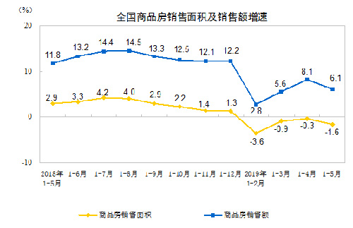 1-5月份,全國商品房銷售面積48703萬平方米,同比下降12.3%,降幅比1-4月份收窄7.0個(gè)百分點(diǎn)。其中,住宅銷售面積下降11.8%,辦公樓銷售面積下降26.7%,商業(yè)營(yíng)業(yè)用房銷售面積下降21.7%。