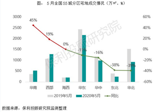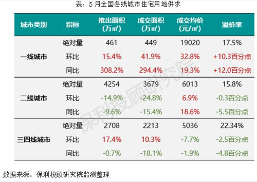 保利投顧研究院發(fā)布的月報顯示,土地市場,一線城市5月表現(xiàn)全指標(biāo)“飄紅”,市場熱度不減,供應(yīng)量為同期3.1倍,成交量為同期2.9倍。一線四城均出讓多幅優(yōu)質(zhì)地塊,受深圳龍光南山地塊、北京合生豐臺地塊高溢價成交帶動,整體溢價率同比提升12個百分點。