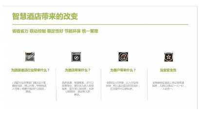 具體說來,“從入住前、入住中和入住后。入住前解決了VR選房、微信訂房、無人化前臺(tái)、遠(yuǎn)程的查房,包括智能門鎖、智能窗簾、智能溫濕度和語音控制大家電。入住后的微信退房、預(yù)約發(fā)票、一鍵續(xù)住,都有整套的酒店智能化功能!