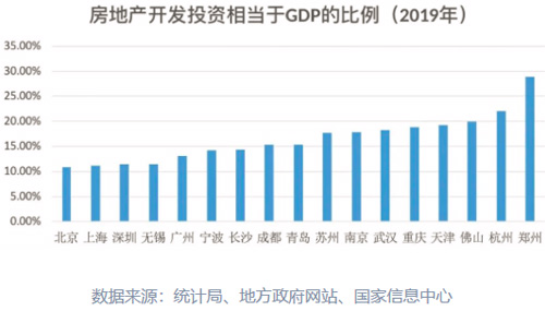 所幸的是鄭州近幾年也一直在努力減少對(duì)房地產(chǎn)的依賴:2017年鄭州房地產(chǎn)開發(fā)投資相當(dāng)于GDP的比例比是36.8%,2018年占比是32.1%,而到了2019年下降為28.9%。