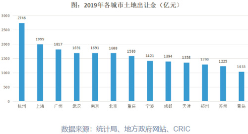 這主要是由于2019年,杭州以2746億元蟬聯(lián)土地出讓金榜首,較2018年增幅高達(dá)13%,較第二位的上海高出700余億元,約是北京土地出讓金的1.6倍,深圳的3.9倍。