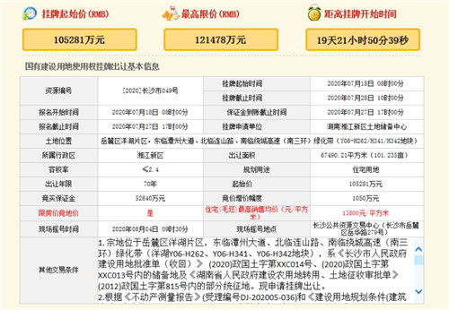 公開信息顯示,今日公示的編號為[2020]長沙市049號雙限地,位于洋湖片區(qū)雅禮洋湖中學(xué)的東南角,出讓面積67490.21平方米,規(guī)劃用途為純住宅,容積率≤2.4,建筑密度≤22%,建筑高度80米,起始價為105281萬元,住宅毛坯銷售價格不超過13800元/平方米,土地最高限價為121478萬元。