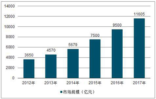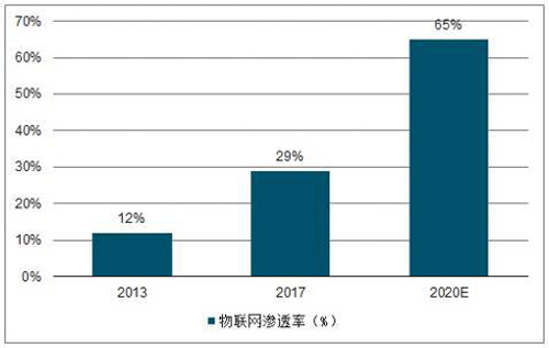 在行業(yè)滲透方面,全球物聯網行業(yè)滲透率 2013、2017 分別達 12%、29%,提升一倍多,預計2020年有超過 65%企業(yè)和組織將應用物聯網產品和方案。近年來,我國物聯網市場規(guī)模不斷擴大,2012年的 3650 億元增長到 2017 年的 11605 億元,年復合增長率高達 25%。