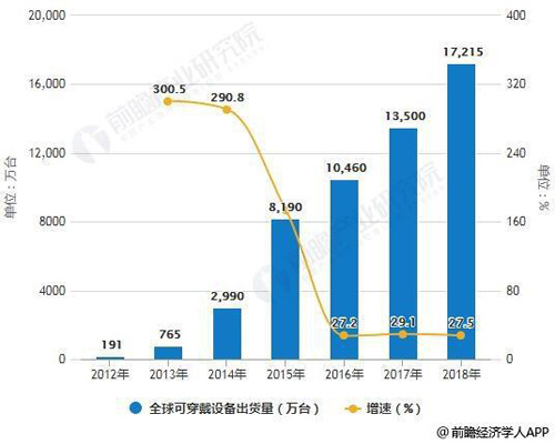 2012-2018年全球可穿戴設備出貨量統計及增長情況(數據來源:前瞻網)