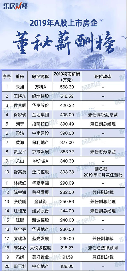 房地產(chǎn)是個造富的行業(yè),房企高管千萬年薪及高額分紅屢見不鮮,董秘的薪酬能達到什么水平?2019年,90位A股上市房企董秘總薪酬約1.22億元,同比增長16.2%;平均薪酬135.13萬元,同比增長8.8%。其中,萬科朱旭以568.30萬元薪酬蟬聯(lián)A股上市房企 “最貴”董秘,綠地王曉東以518.59萬元薪酬位列第二。