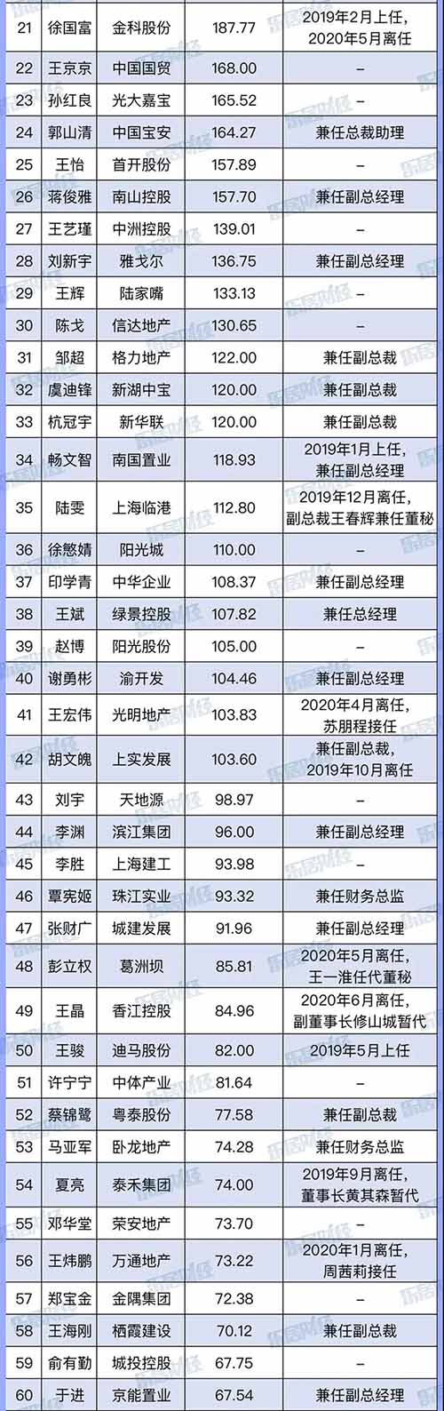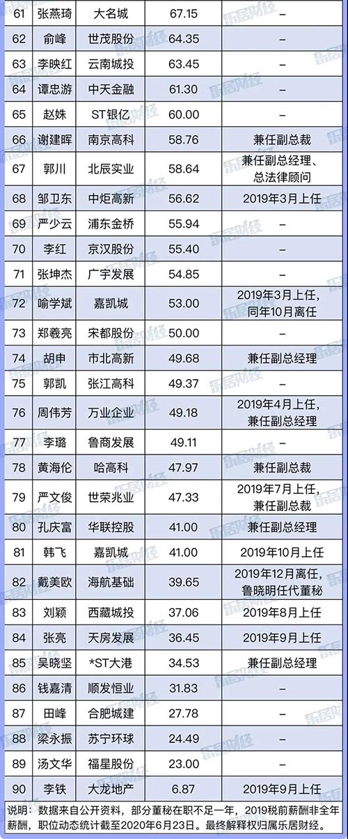 同為董秘,薪酬兩極分化嚴重。若排除2019年9月上任的大龍地產(chǎn)董秘李鐵,90位A股上市房企董秘中,最低薪酬在23萬左右,與排在榜首的明星董秘相差近24倍。