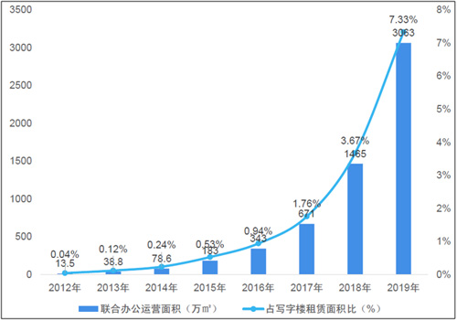 圖表 2012-2019年中國(guó)聯(lián)合辦公運(yùn)營(yíng)面積及占比