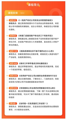 據(jù)悉,此次課程包括《這樣高效的業(yè)務(wù)管理,你還不知道》、《提高客戶轉(zhuǎn)化的三要素》、《業(yè)主的小心思你都懂嗎?》、《有效帶看》、《業(yè)務(wù)報表制作》、《經(jīng)營數(shù)據(jù)分析》、《如何述職?》共計七堂大課,培訓(xùn)跨度一個月,預(yù)計該課程將推動100家中小經(jīng)紀(jì)企業(yè)完成數(shù)字化轉(zhuǎn)型,實現(xiàn)房產(chǎn)經(jīng)紀(jì)科技化的深度應(yīng)用,促進新型房產(chǎn)經(jīng)紀(jì)人才職業(yè)化培養(yǎng)。