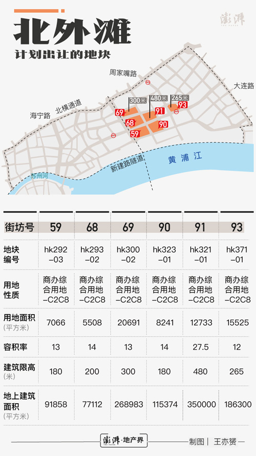 480米高樓所在的91街坊,占地面積1.2733萬平方米,容積率達(dá)到27.5,地上建筑面積為35萬平方米。69街坊地塊上計(jì)劃建造的300米高大樓,占地面積為2.0691萬平方米,容積率為13,地上建筑面積約26.8983萬平方米。緊鄰提籃橋地鐵站旁的93街坊地塊將會(huì)新建一棟265米高的大樓,用地面積約1.5525萬平方米,地上建筑面積達(dá)到18.63萬平方米。