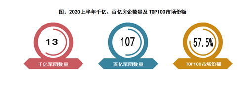 2020年上半年,房企逐步修復(fù)因疫情影響的業(yè)績,TOP100房企銷售額均值為512.1億元,同比下降1.45%;其中銷售額破千億房企13家,較去年同期(12家)增加1家;百億房企107家,較去年同期(121)減少14家。TOP100房企權(quán)益銷售額共計3.7萬億元,市場份額為57.5%,上升4.5個百分點。單月來看,6月TOP100房企銷售額同比上升29.3%,環(huán)比上升45.6%,銷售業(yè)績保持穩(wěn)步增長。