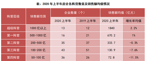 2020年上半年,超級陣營增長顯著,房企不同陣營的發(fā)展策略呈現(xiàn)分化。1000億以上超級陣營共13家,銷售額增長率均值為2.20%,其中金茂增速超30%,帶動超級陣營業(yè)績增速回正,恒大等企業(yè)憑借廣泛的布局,多地聯(lián)動、集中推盤,實現(xiàn)業(yè)績的穩(wěn)定發(fā)展。第一陣營(500-1000億)共16家,銷售額增長率均值為1%,該陣營的企業(yè)注重打造特色產(chǎn)品以及運營模式,推動業(yè)穩(wěn)定發(fā)展。第二陣營(200-500億)有35家企業(yè),銷售額增長率均值下降0.3%,該陣營企業(yè)在穩(wěn)固大本營的同時注重區(qū)域協(xié)同發(fā)展,積極拓展重點城市群的核心城市,與去年基本持平;第三陣營(100-200億)和第四陣營分別為43家和36家,銷售額均值分別為130.9億元和72.8億,同比分別下降7.6%和11.5%,企業(yè)內(nèi)部分化更加凸顯,花樣年等部分企業(yè)憑借區(qū)域深耕,緊抓粵港澳、長三角等熱點城市發(fā)展機遇,以綠色科技等產(chǎn)品特色,或城市更新等業(yè)務(wù)運營模式的差異化實現(xiàn)業(yè)績增長。